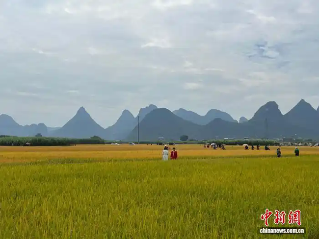 10月25日,广西柳州市柳城县古砦仫佬族乡稻浪滚滚,金黄的稻田与远山交相辉映。村民摆摊售卖农产品,游客漫步田间,拍照定格美好瞬间。