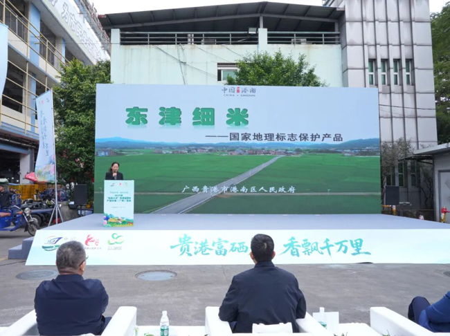 ▲港南区作题为《东津细米——国家地理标志保护产品》推介。