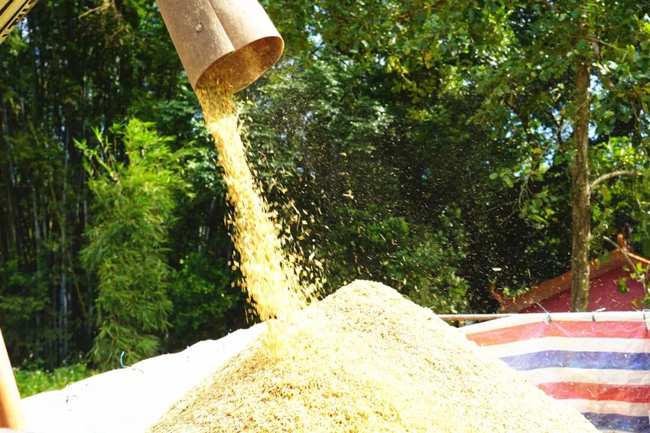 ▲收割的稻谷落入运输车辆货仓内。