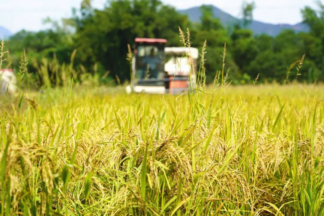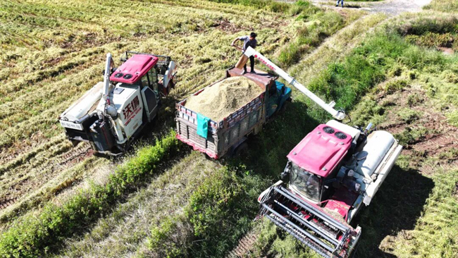 ▲收割机正在收割沉甸甸的稻谷,确保颗粒归仓。