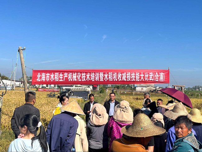 日前,由北海市农业机械化服务中心主办,合浦县农业机械化服务中心承办的全市水稻机收减损技能大比武活动在合浦县石康镇隆重举行。此次活动旨在深入贯彻落实国家粮食安全战略,全面提升水稻机械化收获作业质量,最大限度降低田间损失,确保粮食颗粒归仓。