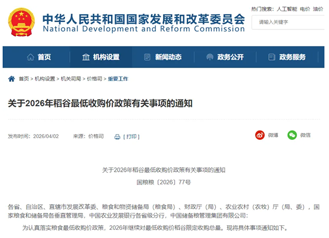 国家发展改革委、财政部、农业农村部、国家粮食和储备局共同发布关于公布2026年稻谷最低收购价格的通知。