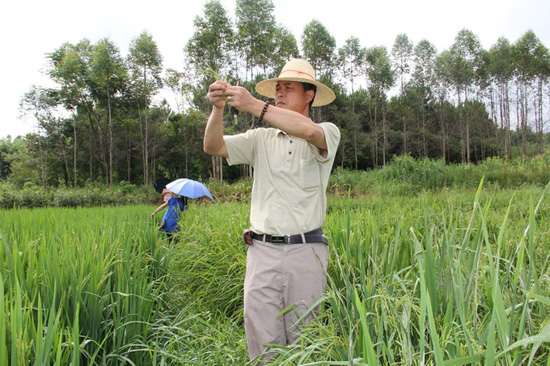 图为平桂管理区农业技术推广站技术员查看早稻生长情况