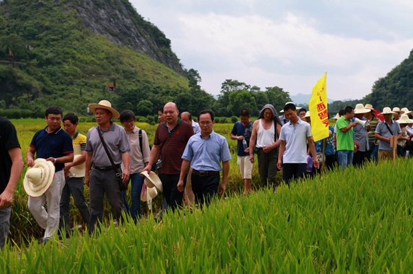 7月18日,灵川县2016年水稻新品种现场观摩会在位于九屋镇岩背村的示范基地举行。来自该县农业局、各乡镇农技推广站、全县种粮大户及种子经营点的80余名人员到现场观摩。观摩会由灵川县农业局、广西智友生物有限公司联合举办。