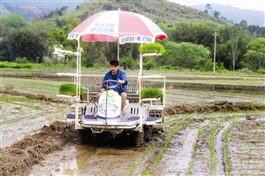 近日,蒙山县新圩镇古定村庆伟家庭农场农机手用插秧机抢插富硒水稻秧苗。今年早稻,蒙山县庆伟家庭农场种植富硒稻数量多、面积大,整个耕作过程全部采用农业机械化作业,100多亩富硒稻采用插秧机插田,进度快、质量好,为富硒稻增产丰收打下了良好的基础。