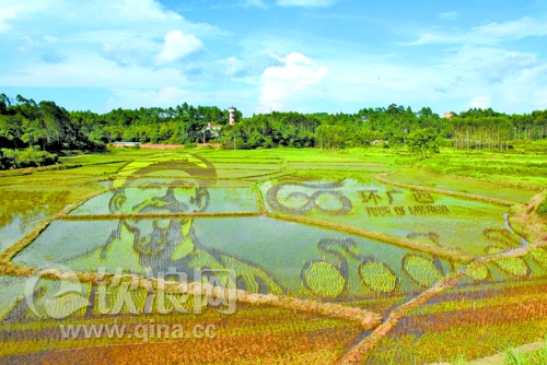 该局结合钦州特色和环广西公路自行车世界巡回赛,突出钦州人文历史、文化旅游,以紫色、黄色、浅白色、绿色四种彩色水稻为“颜料”,以45亩稻田为“画布”,绘出了栩栩如生的“民族英雄冯子材”头像、“钦州欢迎您”和“环广西”标语文字及动漫的自行车组成生动、立体的优美画卷,俨然成了当地的一道靓丽的风景。“这块稻田艺术总投入30多万元,项目施工时长近一个月,经过了租田、育秧、犁耙田、测量田块、设计、插秧等多道工序。”钦北区农业局生产股股长李春告诉记者,施工人员在8月17日已将四种彩色的水稻秧苗全部插入规划设计好的45亩稻田里,目前稻田艺术已基本完工。随后进入稻田的管护阶段,农业部门将集中力量做好水稻病虫害防治、施肥等工作,确保稻田里的水稻生长良好。