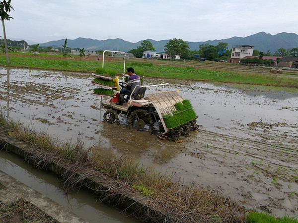图为灵川县兆丰农机合作社新型插秧机操作现场