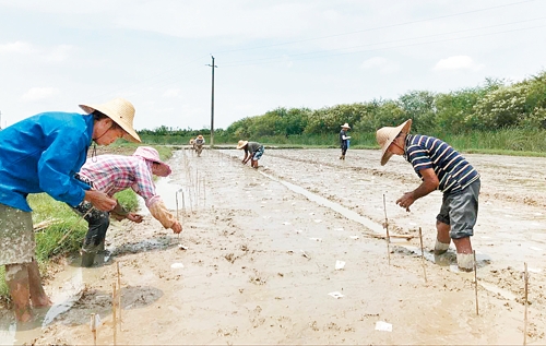 农户在专家示范指导下种植海水稻