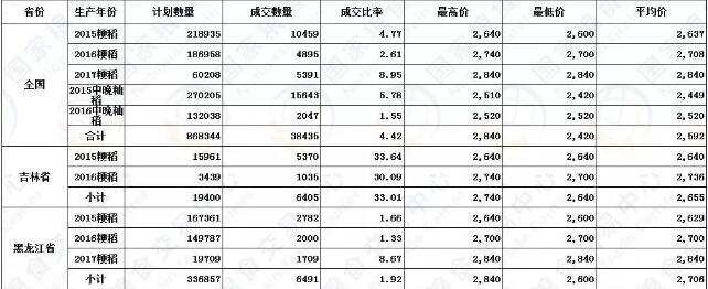 国储稻谷销售方面,由于覆盖面全面,各年份均有成交,具体情况如下: