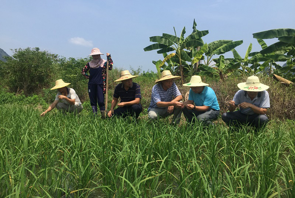 市植保站黄柳春站长、黄树生副站长及马山县农业和林业局韦祖乐副局长、马山县农业技术推广站工作人员正在调查田间情况