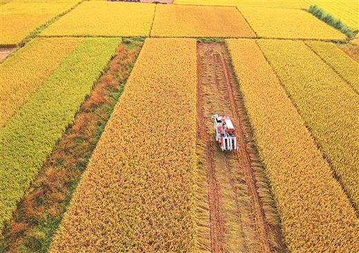 11月4日,在合浦县廉州镇廉西村,村民驾驶收割机在金色的稻田中穿梭忙碌。金秋时节,该县44万亩晚稻迎来收获季,当地农民抢抓晴好天气进行收割,田间地头一片繁忙景象。