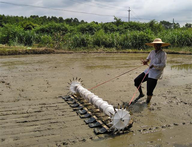 图为来宾市、象州县农业和农机技术推广站技术人员,2019年7月22日在象州县象州镇古才村委山厂村,开展水稻穴直播(水稻穴直播研究结果表明,穴直播水稻生产,利于抢占农时,避开寒露风危害,省工节本、禾苗分蘖力强、成穗率高、高产稳产)和自制穴直播机械试验。试验目的是通过试验明确桂中水稻穴直播不同密度、不同品种、不同施肥水平与禾苗抗倒伏、分蘖力、成穗率及稻谷产量的关系;经生产实际使用表明,自制水稻穴直播机械,成本低、结构简单、操作简单、播种工效高,播种量易于调控,播种顺畅,经过进一步改进和完善后,该穴直播机将是一款具有广阔推广应用前景的创新机械。