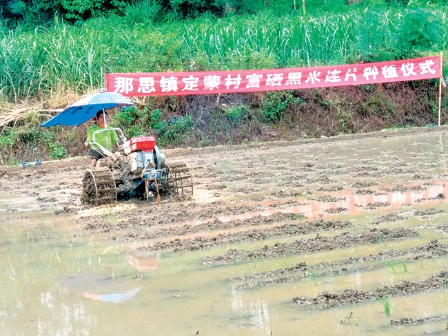 近日,那思镇定蒙村的富硒稻田里机声隆隆,一派热闹景象。这是该村正在进行富硒黑米连片种植仪式,以此推广现代种植技术,进一步推动特色扶贫产业和村级集体经济发展。