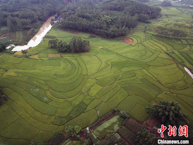6月26日,航拍广西来宾市兴宾区三五镇古炼村的稻田。端午之后,这里的稻田已收穗,丰收在望。古炼村是个三百多人的壮族小山村,地处丘陵地带,拥有一百多亩梯田。层层叠叠的梯田,在稻谷收穗以后,绿中带黄,美如田园画。该村交通便利,距来宾到马山高速公路来宾南出口不到10公里,来宾良江至宾阳武陵二级公路通达村旁。