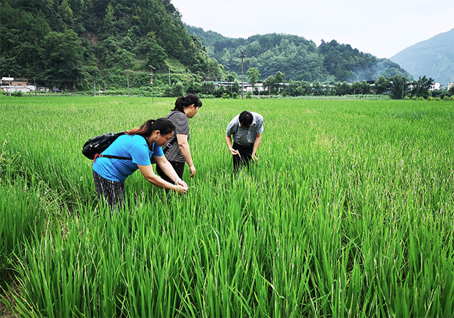6月29日,南丹县城关镇农业技术推广站技术人员对拉易、中平、大平等村的水稻进行长势、病虫害调查。