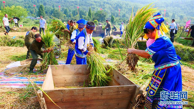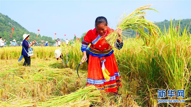 9月15日,一名参赛选手在使用传统镰刀收割水稻。