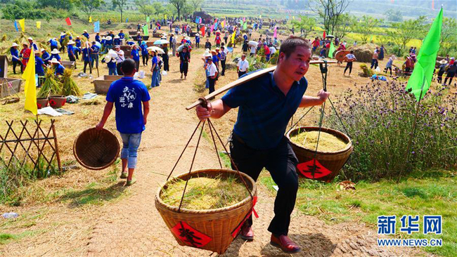 当日,第四届全国农民体育健身大赛在广西全州县举行,一场农味十足的水稻收割竞赛精彩上演。比赛共有5支代表队参赛,每支代表队60人,包括40名男性和20名女性。参赛队伍要在2小时内完成割稻、脱粒、风谷、称重入仓等环节。