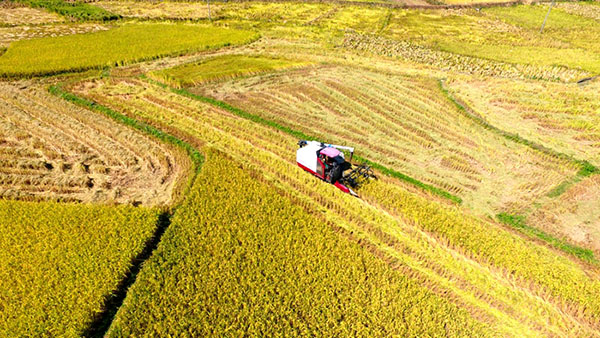 收割机在大新县龙门乡宝山村的田野上收割稻谷。