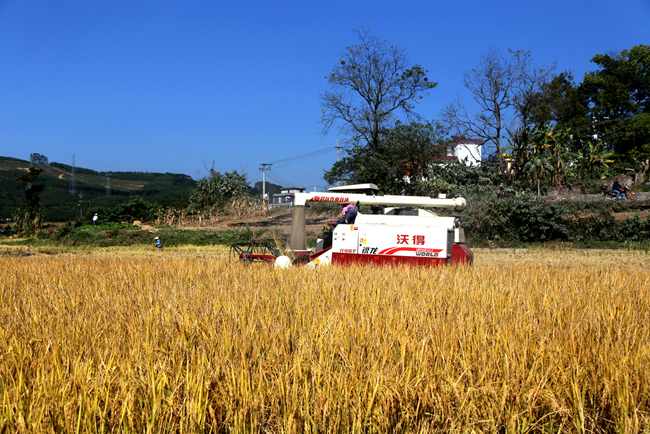 金秋十月,稻穗飘香,在连日晴好天气的催促下,我县晚稻已经进入忙碌的收割阶段。11月13日,在象州镇龙富村水稻新品种试验田里,一块大田里分别种植着“巨丰5号”、“巨丰6号”、“巨丰8号”三个巨型稻品种,放眼望去,它们都长得像高粱一样高,穗长粒多,圆润饱满,沉甸甸的稻谷压弯了稻穗。