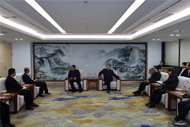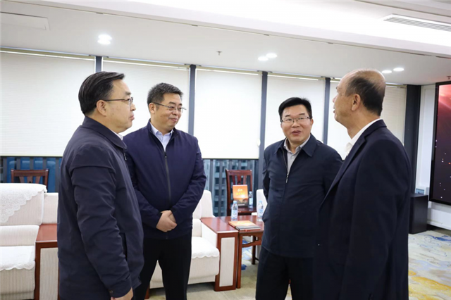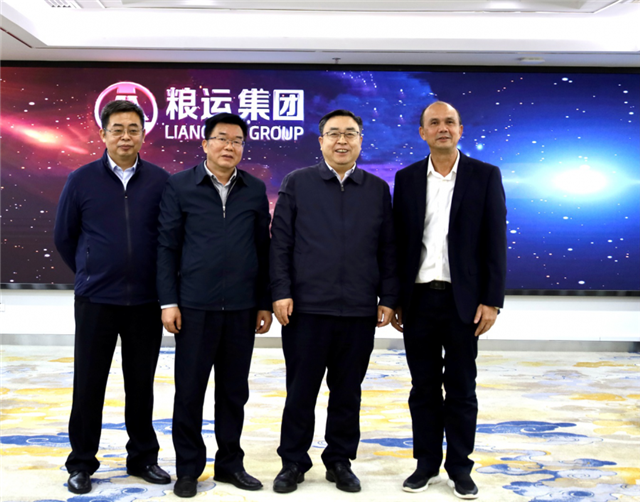 国家粮食和物资储备局党组成员、副局长卢景波(左一)、总工程师翟江临(左二),自治区粮食和物资储备局党组书记、局长吴宇雄(右二),粮运集团董事长陆精华(右一) 亲切交谈