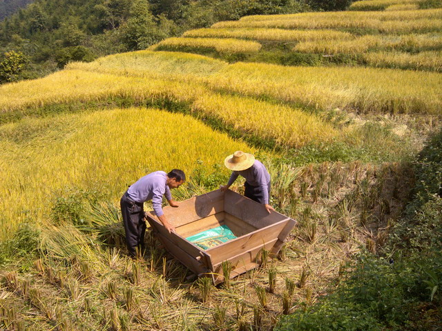 眼下,正是金秀县山内中稻种植区收割的时节。早上下乡,驱车从金秀到三角乡的路上,听到山间“呯呯嘣嘣”的打谷脱粒声不绝于耳,这正是中稻区种 植户收割稻子传来的声音。今年金秀县种植中稻一万多亩,由于山间田块小,地块分散,无法进行机械化收割,种植户还是靠原始的收割方法进行人工收割。截止目 前基本上已经收割完毕。经测产,管理得较好的田块亩产干谷也有1200多斤。